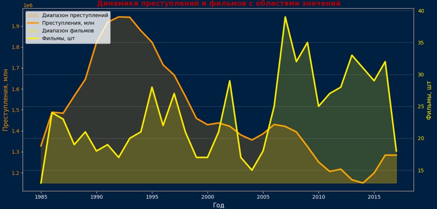 Соединим на одном графике соотношение фильмов и преступлений. Связь фильмов, содержащих сцены насилия с реальными преступлениями скорее случайна, пики практически не совпадают и носят независимый характер.
