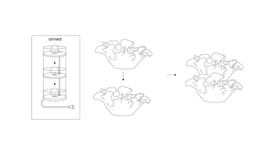 Ключевая особенность Fungi — модульная конструкция: лампа может существовать как самостоятельный объект, либо собираться в вертикальную композицию из нескольких модулей, подобно растущему организму.
