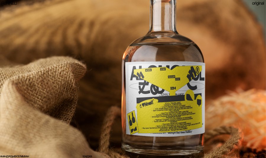 A humorously shaped beer bottle with bold yellow label and black typography, funny product name, custom bottle form, vibrant branding, studio shot, crisp lighting, Funnel brand energy, playful