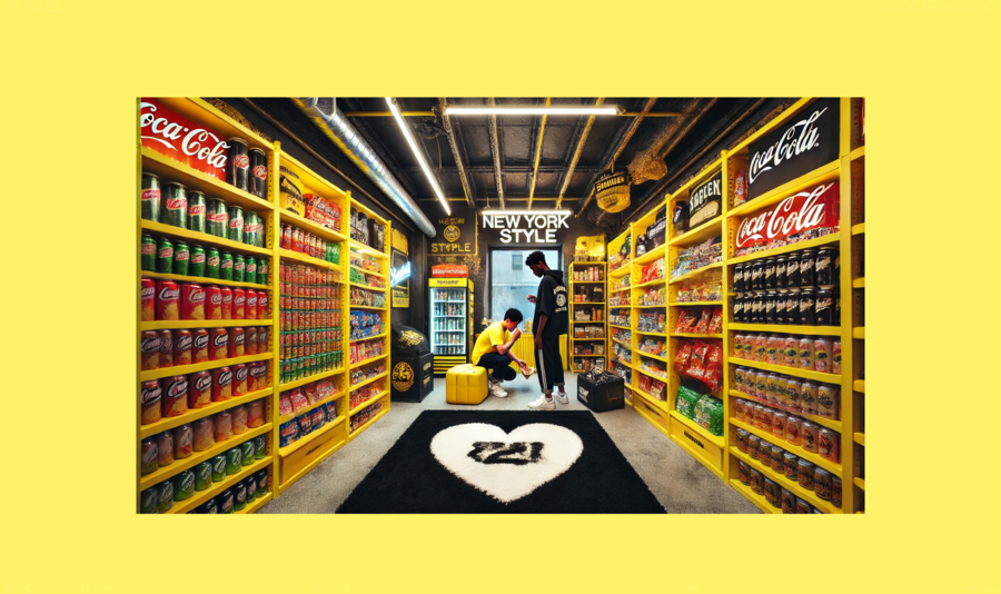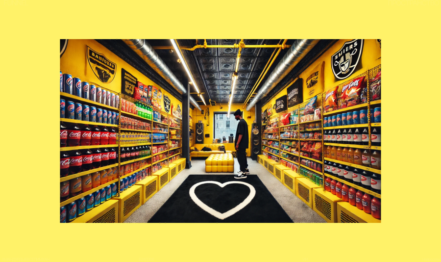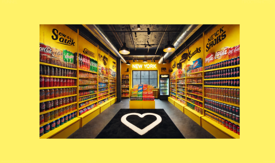 Interior of a small retail store in New York style, entirely painted bright yellow, with massive exposed steel beams and pipes. Shelves and walls fully stocked with colorful soda cans, chips, snacks,