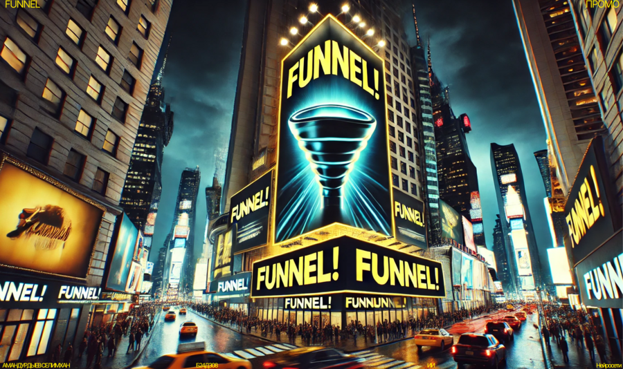 Massive digital screen in Times Square displaying a bold FUNNEL! ad with yellow background and black typography, animated neon accents, surrounded by glowing skyscrapers and crowded streets, night