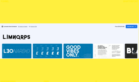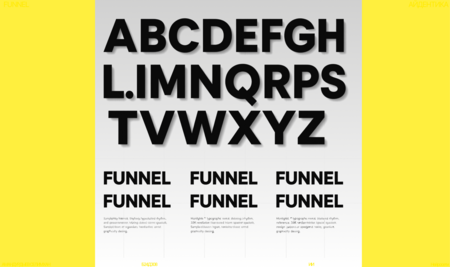Typography specimen showing a bold sans-serif font for headlines and a clean geometric sans-serif for body text. Display uppercase and lowercase characters, and sample words like 'FUNNEL' + Whatthefon