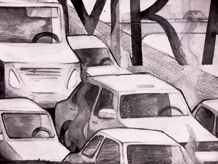 Дорога с вечной пробкой становится источником плотного смога: выхлопы машин сливаются с клубами дыма, окрашивая пространство в серые тона.