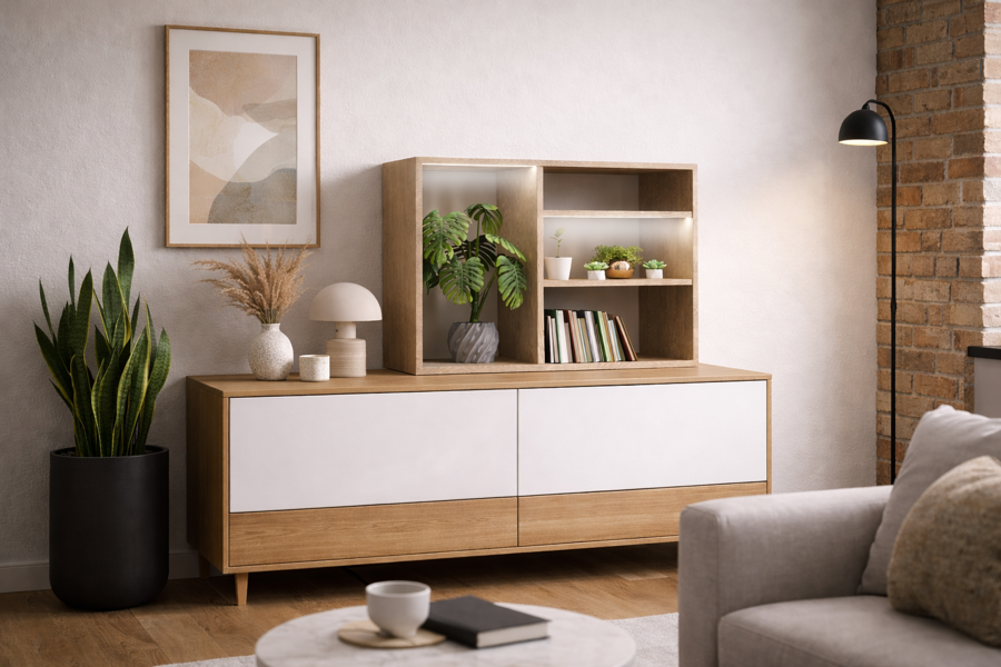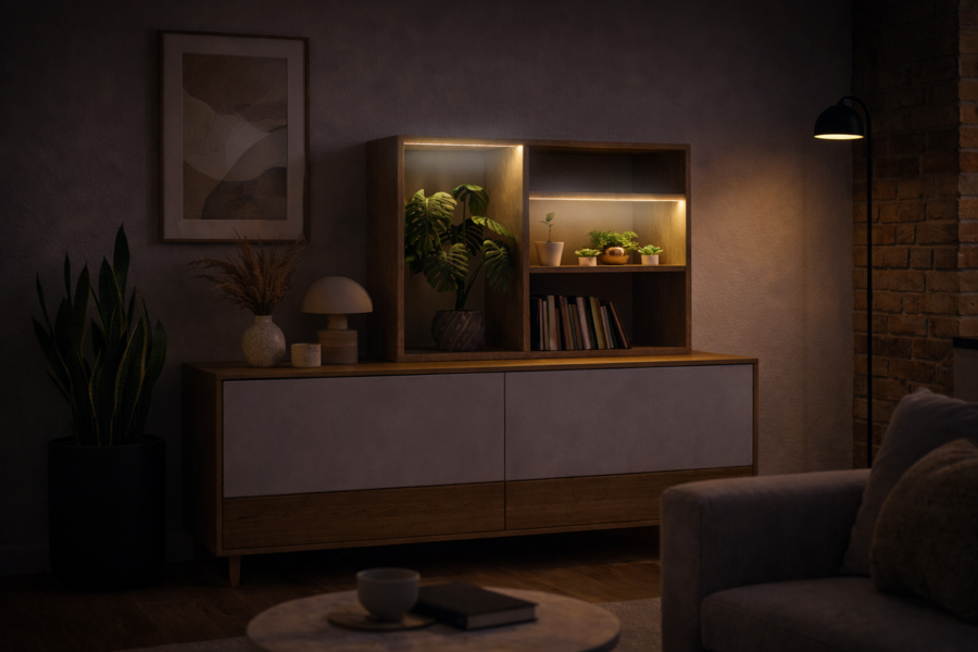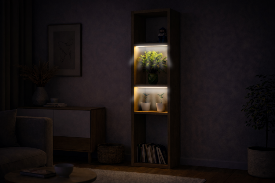 Это гибрид светильника и модульной полки для растений и предметов, созданный специально для компактных пространств и динамичной городской жизни