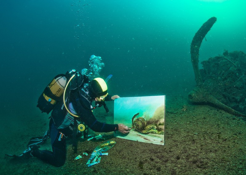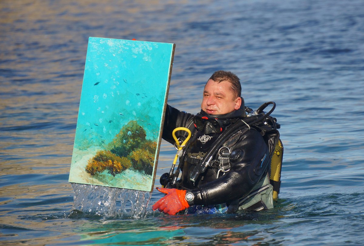 Проект посвящен творчеству Олега Небесного, художника, работающего на глубине от двух до двадцати метров. Его фамилия символизирует связь между небом и океаном, делая его живым мостом между стихиями. Погружение — это акт инверсии, подчеркивающий единство неба и океана, разделенных лишь тонкой гранью реальности.