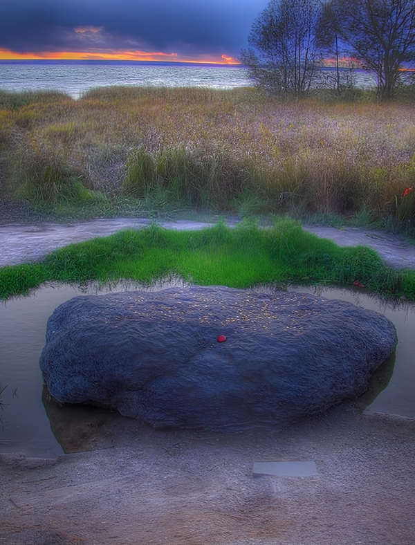 Я представил этот момент — тяжесть, холод, тишину под водой. Казалось бы, история должна была закончиться там. Но через десятилетия камень снова оказался у берега. Не всплыл — его вернули движение льда, течение, изменение линии берега. Природа сделала то, чего не смог человек: не уничтожила и не возвысила, а просто сохранила.