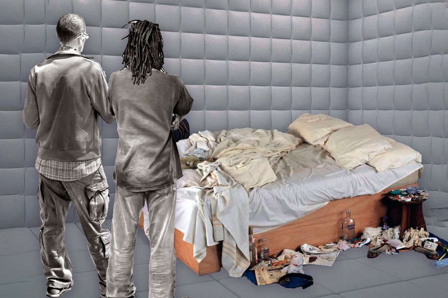 Пространство, в котором расположена выставка, представляет из себя больницу, состоящую из системы замкнутых коридоров. Здание симметрично, а арт-объекты расположены четко и соответствуя друг другу, однако здесь нет входа или выхода — ведь мы не можем убежать или избавиться от собственного тела и разума.