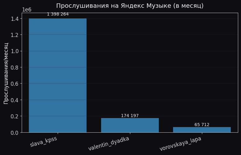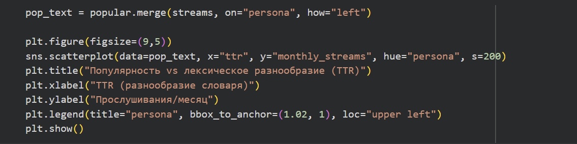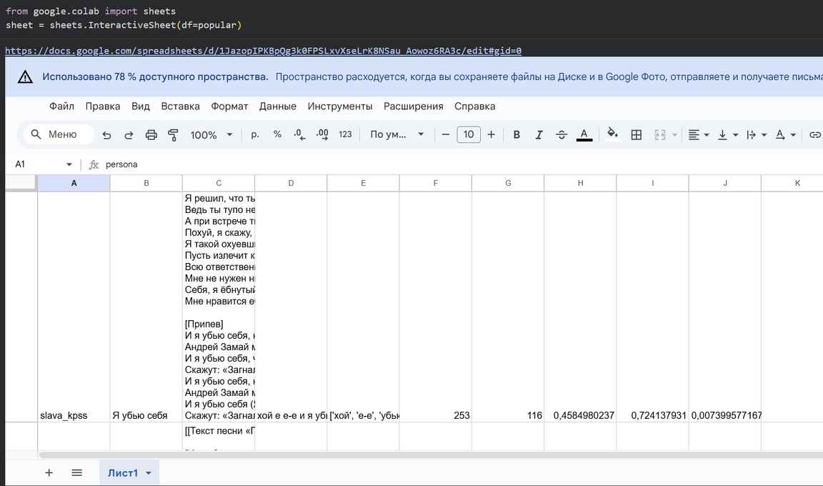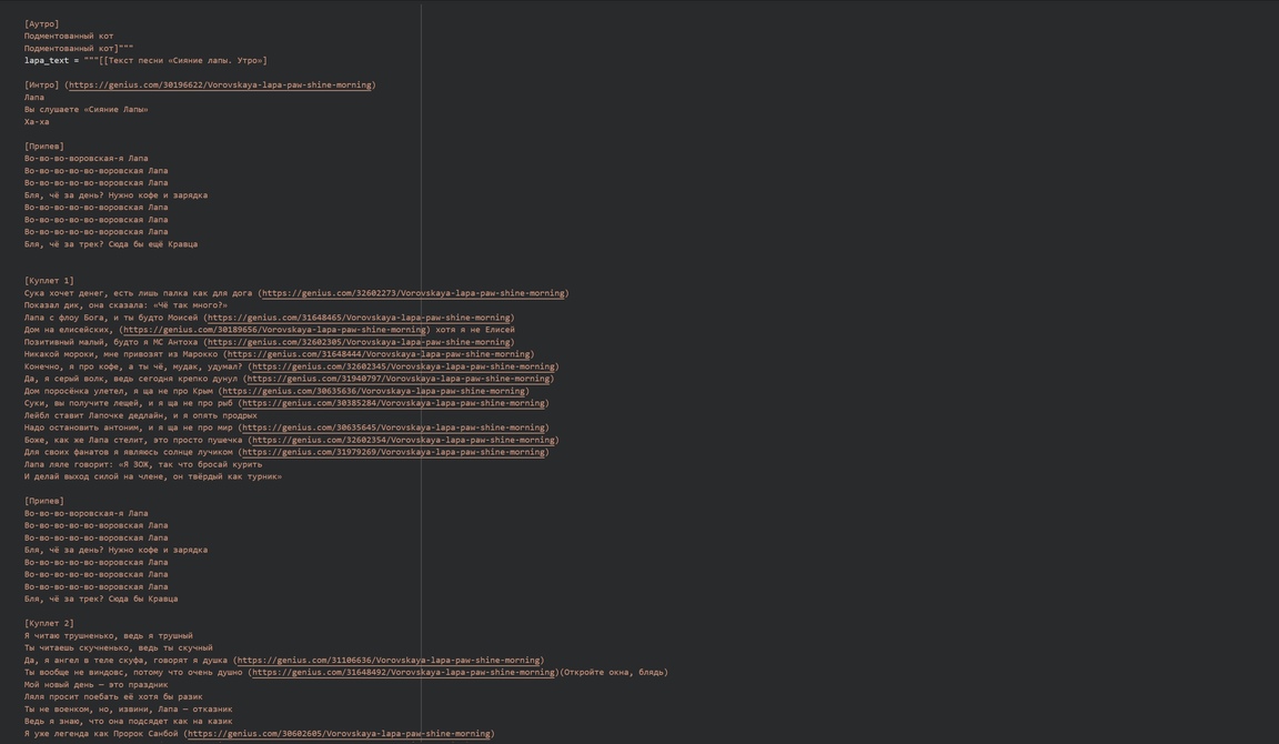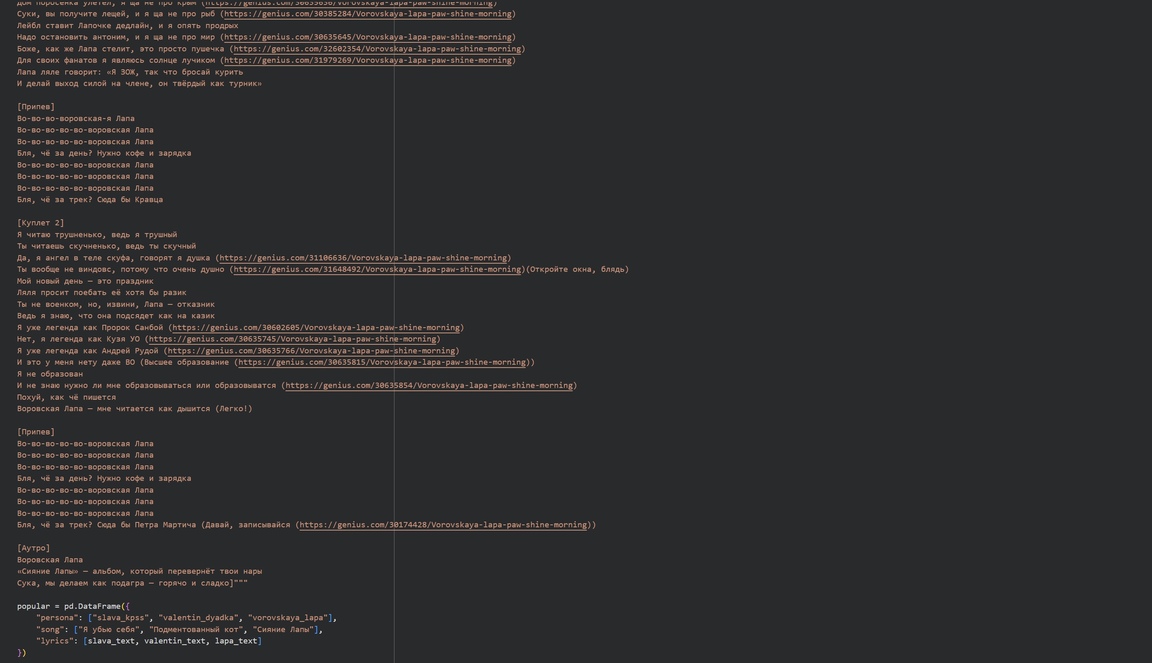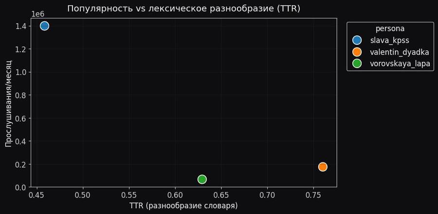 В итоге стало видно, что разные личности Славы КПСС — это не просто разные имена, а реально разные способы говорить с аудиторией. У Славы КПСС тексты проще и повторяемее, за счёт чего они легче запоминаются и находят массового слушателя. Валентин Дядька и Воровская Лапа, наоборот, больше работают с историей, иронией и экспериментом, поэтому остаются более нишевыми проектами. Визуализация помогла наглядно показать эти различия и связать особенности текстов с популярностью, доказав, что анализ данных может быть полезным даже при разборе музыкального и культурного материала.