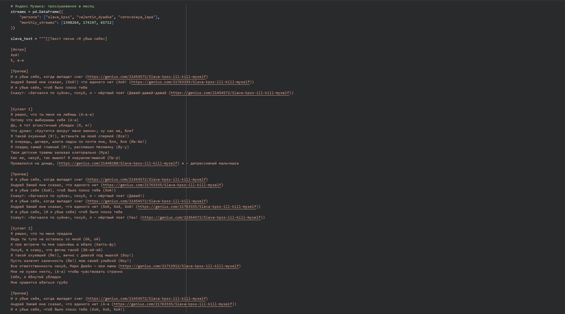 В данном проекте анализируются тексты песен Славы КПСС, а также данные о популярности его различных художественных личностей на платформе Яндекс Музыка.