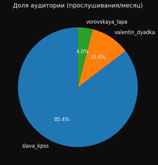 Круговая диаграмма отображает распределение аудитории между личностями. Слава КПСС занимает подавляющую долю, в то время как Валентин Дядька и Воровская Лапа формируют нишевые сегменты.