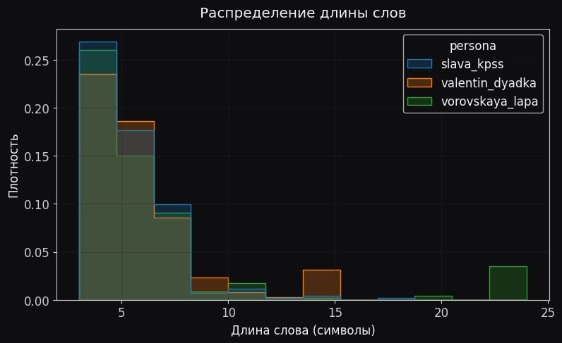 Гистограмма показывает, какие слова доминируют по длине у каждой личности. • Слава КПСС чаще использует короткие слова. • Валентин Дядька склоняется к средней длине. • Воровская Лапа выделяется длинными и необычными словами.