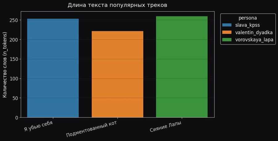 Сравнение самых узнаваемых треков показывает, что длина текста не определяет успех напрямую.