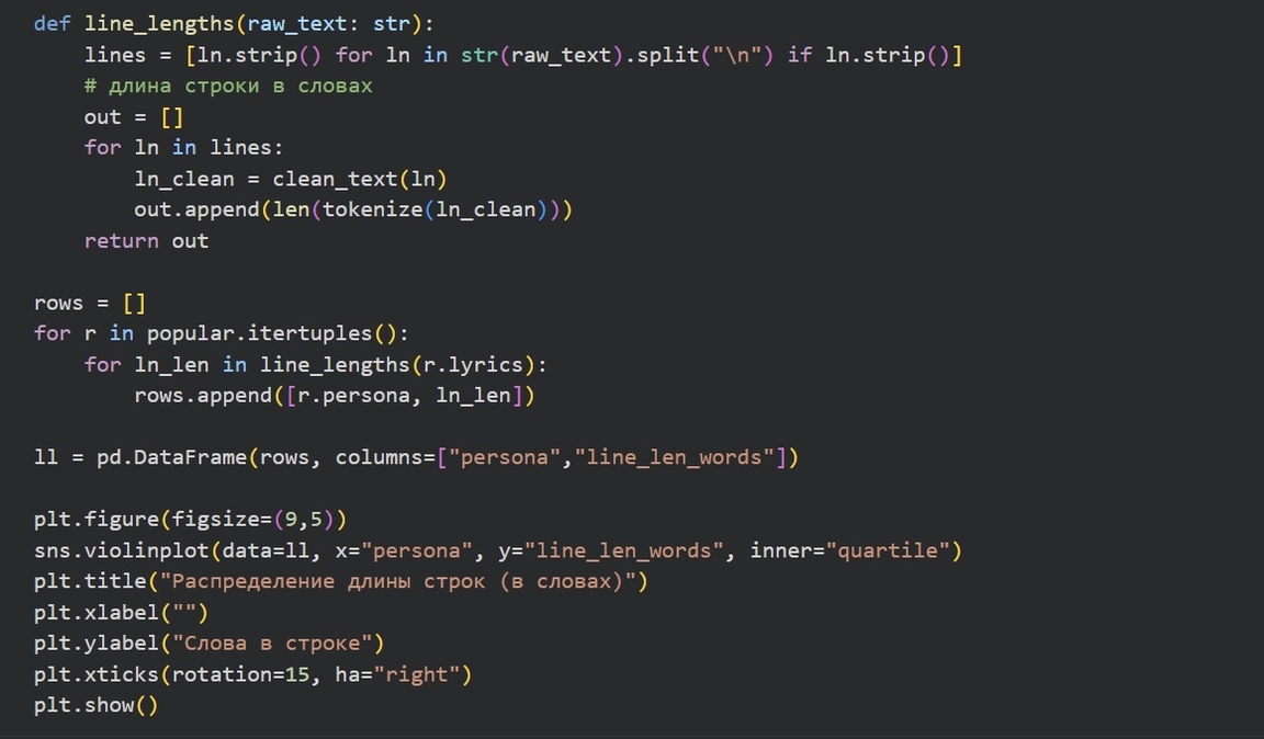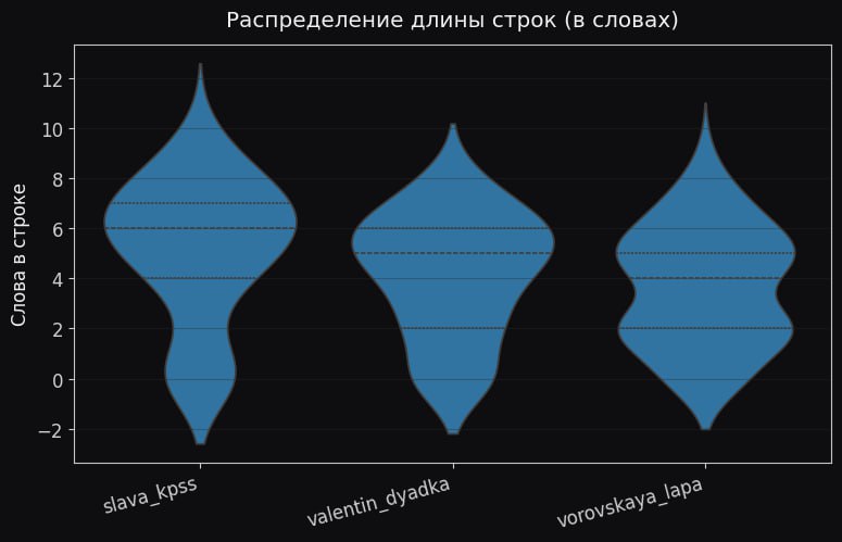 Скрипичная диаграмма показывает плотность длины строк (в словах). • Слава КПСС использует более длинные строки. • Валентин Дядька балансирует между короткими и средними. • Воровская Лапа чаще использует короткие, разговорные конструкции.
