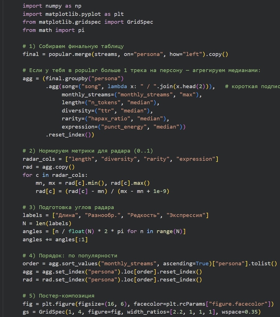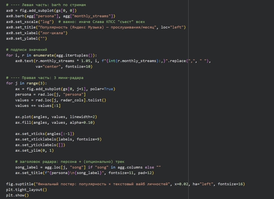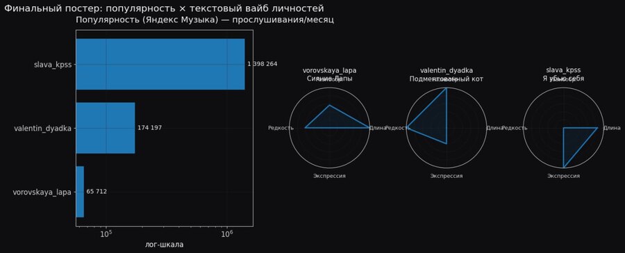 Итоговая композиция объединяет: • популярность, • текстовые метрики, • визуальный «отпечаток» каждой личности.