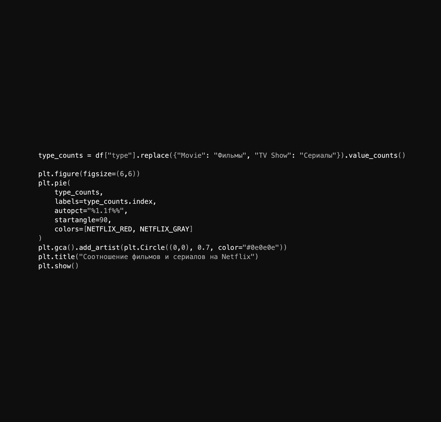 Для визуализации данных я выбрала различные виды графиков, которые помогают наглядно отразить структуру и тенденции контента Netflix: