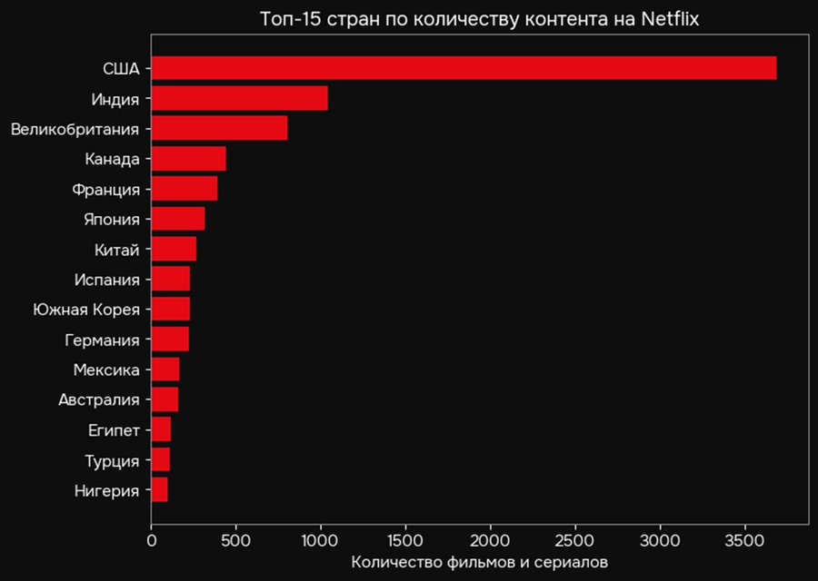 Столбчатая диаграмма наглядно показывает, какие страны производят больше всего фильмов и сериалов для Netflix. Лидерами являются США и Индия, что отражает глобальные тренды в индустрии развлечений и ориентацию платформы на аудиторию этих стран.