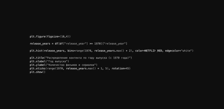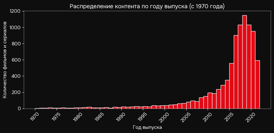 Гистограмма демонстрирует динамику выпуска фильмов и сериалов. Видно, что с течением времени количество контента постепенно увеличивается, особенно после 2000-х годов, что связано с ростом популярности потокового видео и экспансией Netflix на новые рынки.