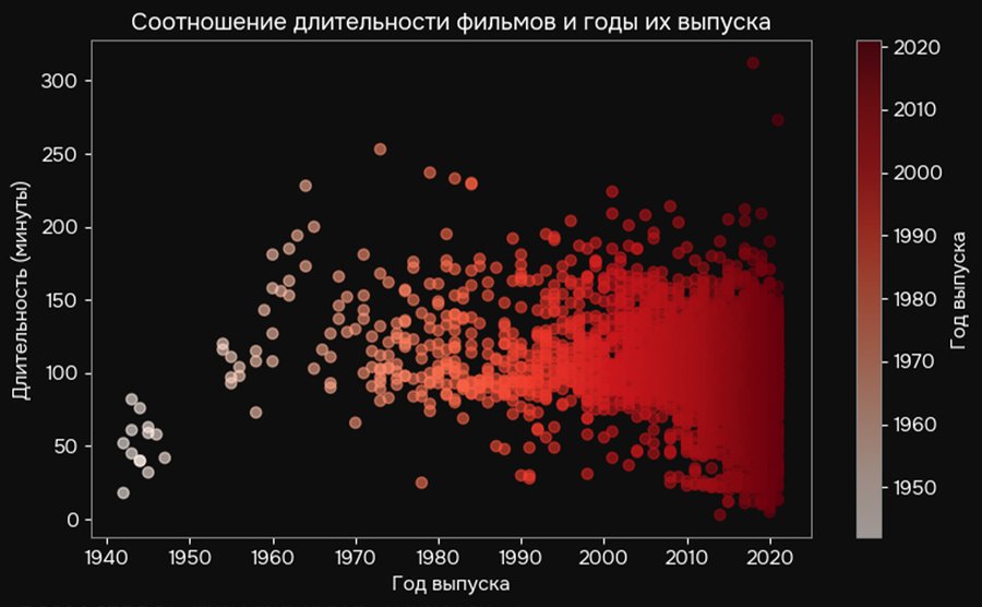 Диаграмма показывает, что длительность фильмов сильно варьируется. В среднем, фильмы последних лет имеют тенденцию к большей длительности, а также наблюдается широкое распределение продолжительности в 1980–2000-х годах. Этот график помогает увидеть, как менялись стандарты длительности фильмов во времени.