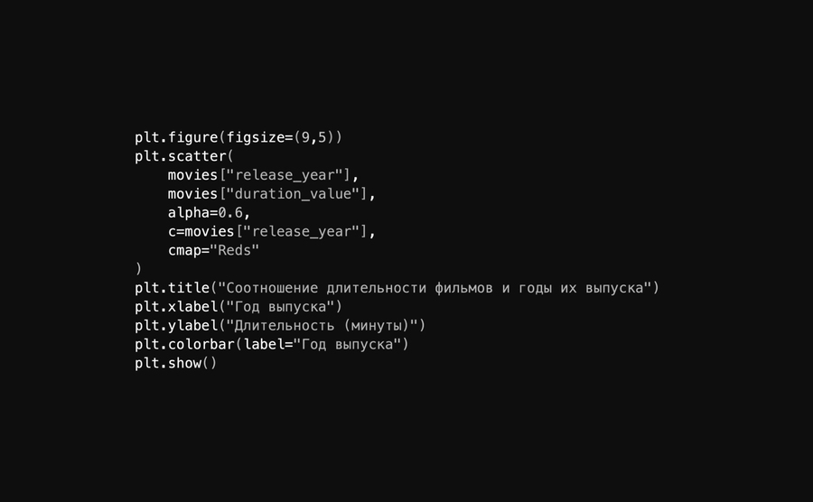 Круговая диаграмма — показывает соотношение фильмов и сериалов на платформе; Гистограмма — демонстрирует распределение контента по годам выпуска; Точечная диаграмма — отражает зависимость длительности фильмов от года выпуска; Тепловая карта — подчеркивает популярность жанров по десятилетиям; Облако слов — показывает актёров, наиболее часто встречающихся в контенте Netflix; Диаграмма размаха — позволяет сравнить распределение длительности фильмов по возрастному рейтингу; Линейные графики — демонстрируют среднее количество сезонов сериалов по годам.