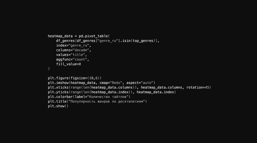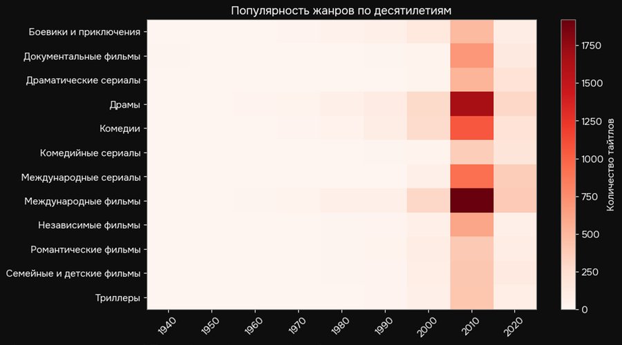 Карта демонстрирует, какие жанры были наиболее популярны в разные десятилетия. Например, драмы и комедии стабильно занимают лидирующие позиции, а международные фильмы и аниме стали набирать популярность в последние десятилетия. График позволяет увидеть исторические тренды и смену предпочтений аудитории.
