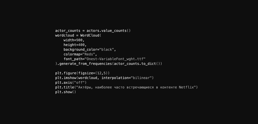 Облако слов наглядно показывает, какие актёры чаще всего появляются в фильмах и сериалах Netflix. Чем крупнее имя, тем больше контента с участием данного актёра. Такой график позволяет быстро определить «звёзд» платформы.