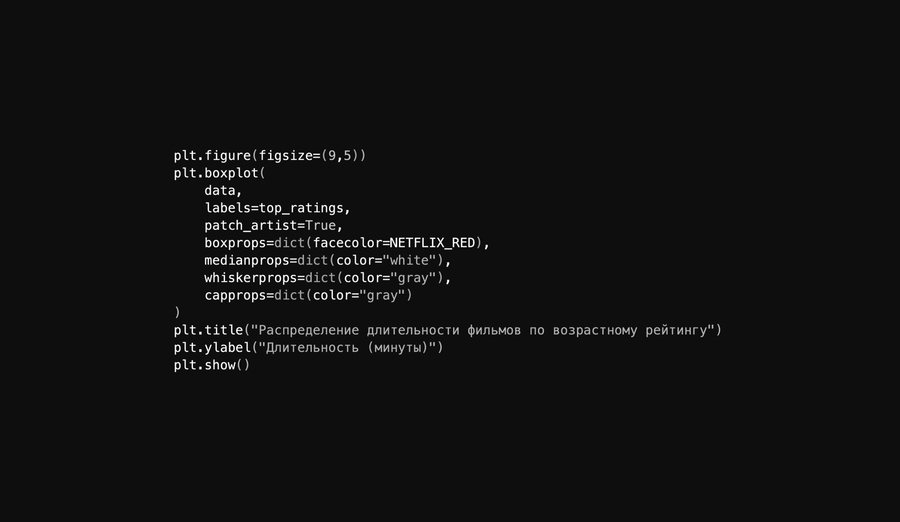 Диаграмма помогает сравнить распределение длительности фильмов в разных возрастных категориях. Например, фильмы для всех возрастов обычно короче, а фильмы с рейтингом 16+ или 18+ имеют большую вариативность и в среднем более длинные.