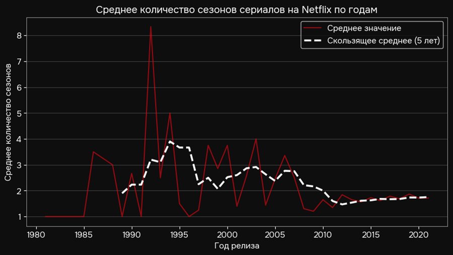Линейный график показывает, как изменялось среднее количество сезонов сериалов с течением времени. Скользящее среднее позволяет видеть долгосрочные тенденции и сглаживает резкие колебания. Например, видно, что количество сезонов медленно увеличивается, что отражает очередное изменение трендов формата сериалов на Netflix. Конечно, это ещё меньше чем количество сезонов в 90-х, но определённая тенденция есть.