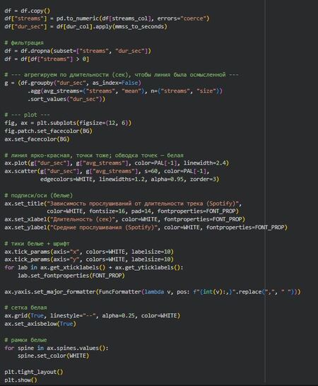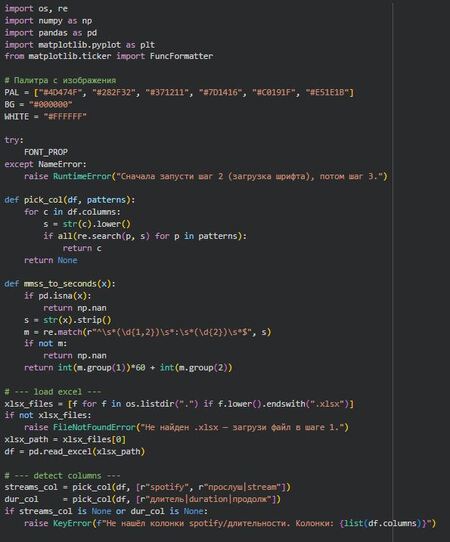 4. Определили колонки прослушиваний и длительности. Через pick_col нашли столбец со Spotify-стримами и столбец с длительностью; если не нашли — ошибка.