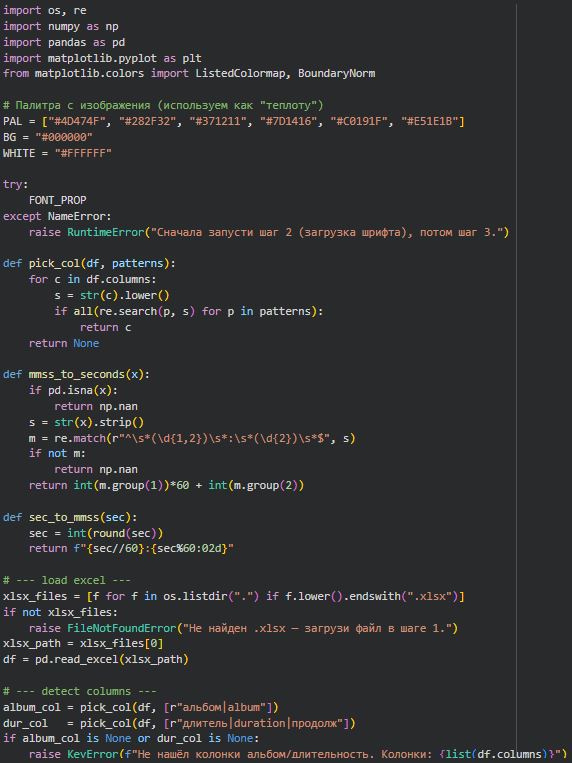 Изначальный промт: Напиши код для работы с базами данных. Код должен работать в гугл коллаб и быть написан на питоне. Он должен включать в себя такие шаги: возможность загрузки эксель файла, возвожность загрузки шрифта. Третьим шагом напиши код для кругового графика, который визуализирует процентное соотношение прослушивание по альбомам. Бери приложенную палитру за основу для цветов долей, фон чёрный, а линии и текст — белые.