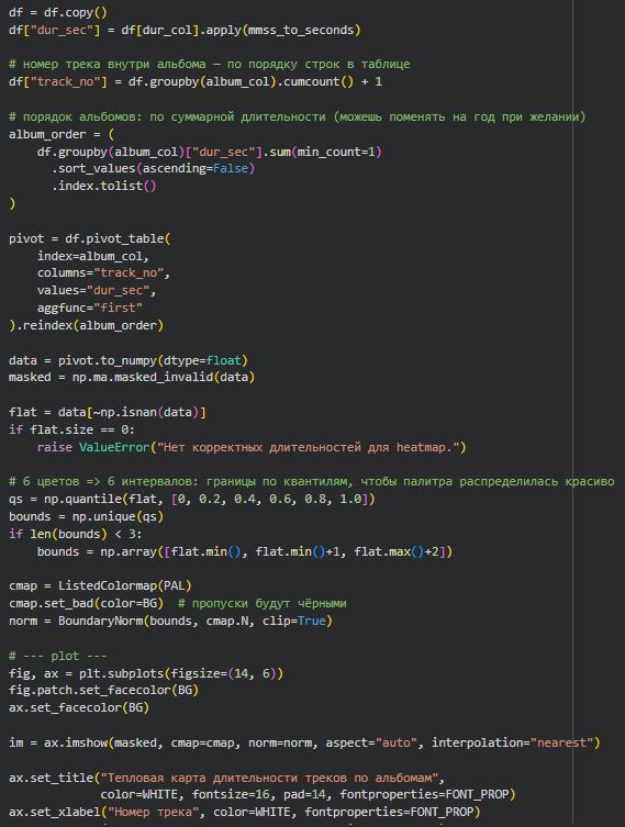 2. Сделали функции-помощники. pick_col — ищет нужные колонки по шаблонам. mmss_to_seconds — переводит mm: ss в секунды. sec_to_mmss — переводит секунды обратно в mm: ss для подписей colorbar.