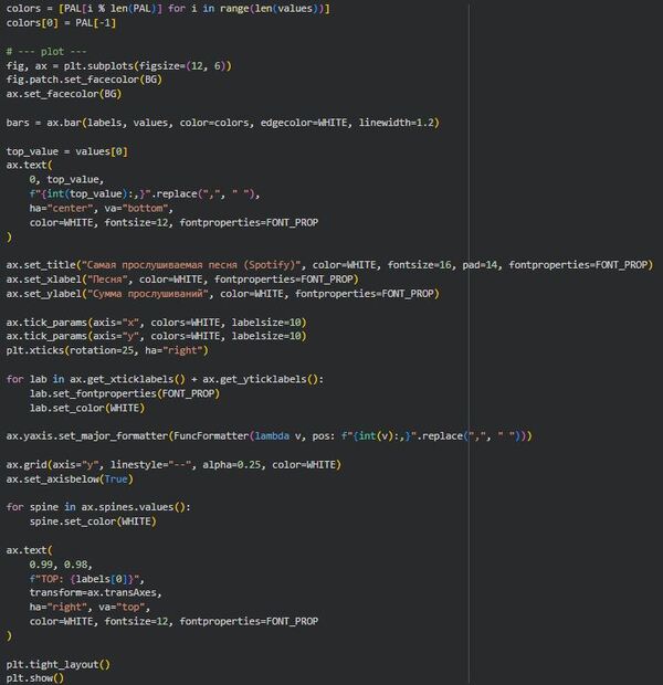 9. Оформили подписи и читаемость. Добавили заголовок и подписи осей, повернули подписи песен на оси X, сделали все тексты белыми и применили загруженный шрифт.