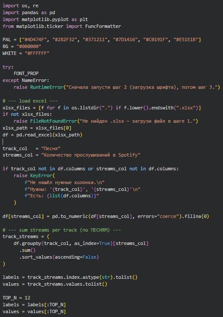 1. Подключили библиотеки и задали стиль графика. Импортировали pandas для работы с таблицей, matplotlib для графика, задали палитру цветов, чёрный фон и белый цвет для текста/линий. Проверили, что шрифт уже загружен на шаге со шрифтом.