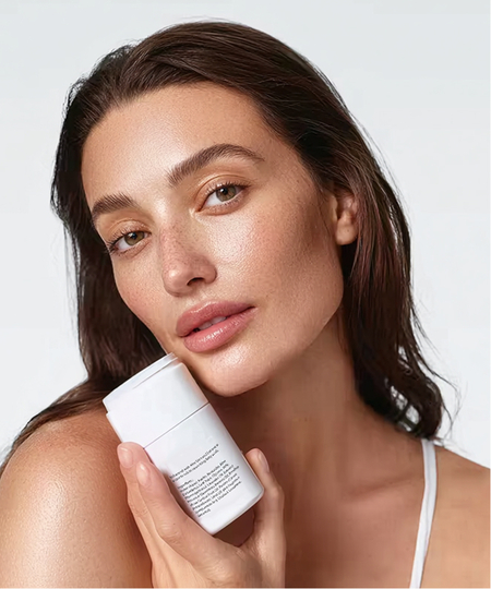 A model with brown hair and sharp collarbones, wearing minimal makeup and holding a plastic white bottle of cream, made from recycled plastic, featuring an eco-friendly design with minimal labels. this is a product photography, beauty advertising shot with soft lighting against a white background for vogue magazine. in the front view, the shot captures its texture and shape, emphasizing the skincare ritual experience. the image has a soft, high-resolution quality, hyper realistic, in david newton style, cinematic, raw, with a shallow depth of field. --v 7.0 --ar 64:63