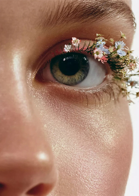 https://s.mj.run/7HC5mDyOZTU a photograph of the model’s eye against an isolated white background, featuring a single eyelash decorated with small flowers. the focus is on her beautiful eyes and delicate facial features. captured in the style of annie leibovitz for vogue magazine.