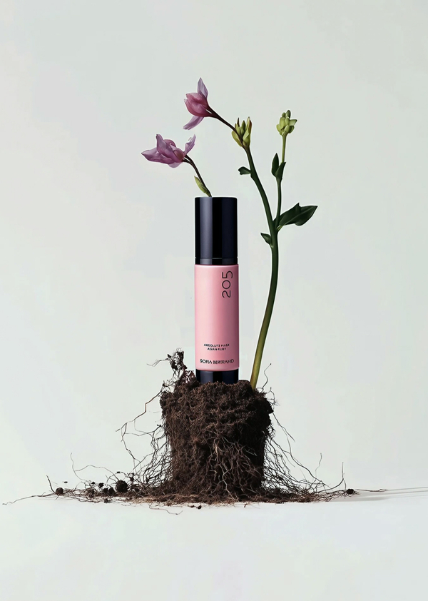 https://s.mj.run/VlyP_3O4mao A transparent, pink-tinted skincare product with the brand name '205' displayed on its black cap is placed inside an empty pot with soil and flower roots. The background should be white to highlight the unique design of each bottle, emphasizing the natural beauty of the product, LOEWE fashion photography style for VOGUE magazine, --sref https://s.mj.run/-wZx7KqBmhg --ar 4:5 --v 6.1