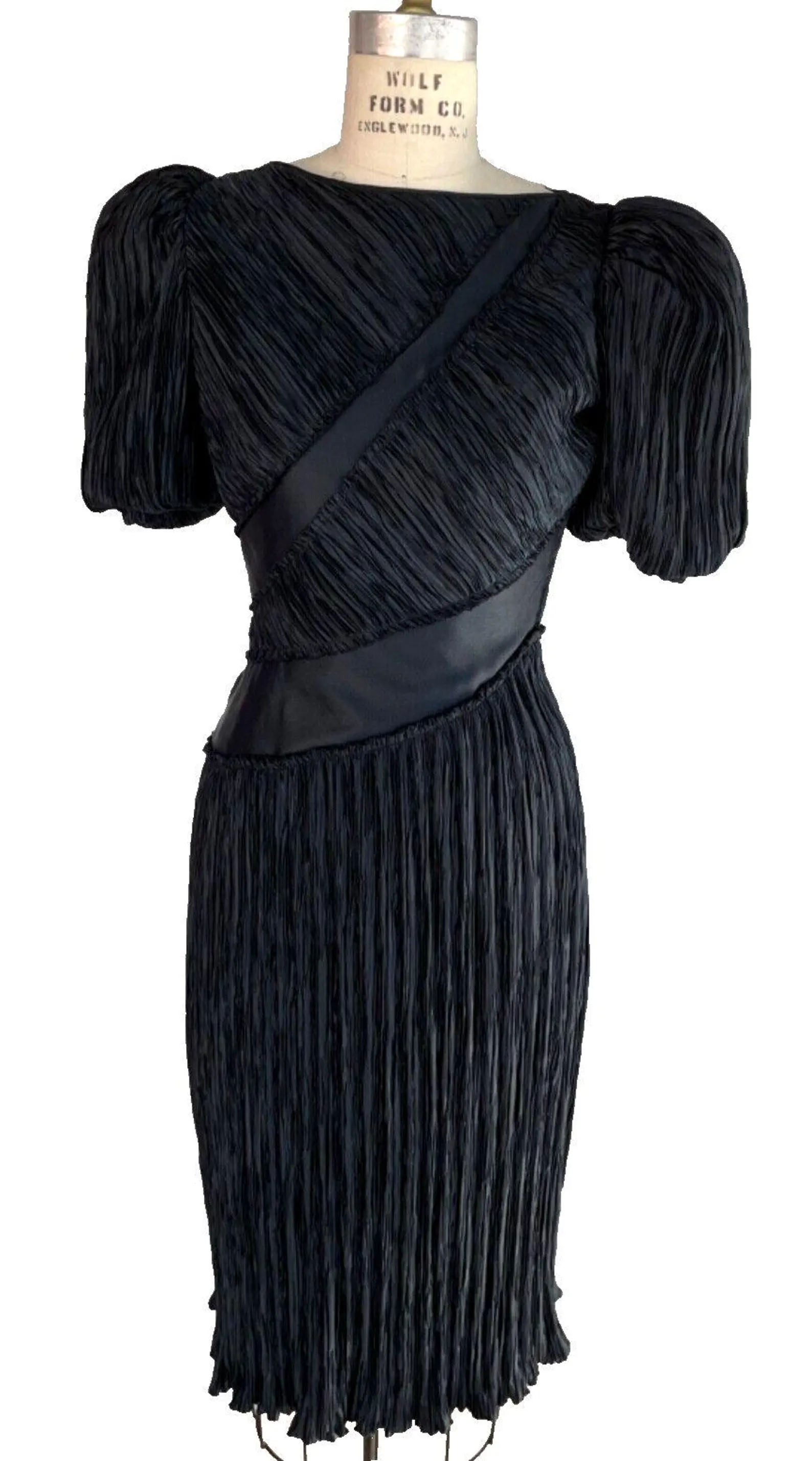 Плиссированное вечернее платье авторства Mary McFadden выполнено в черном полиэстере и деликатно декорировано мелкими кристаллами.