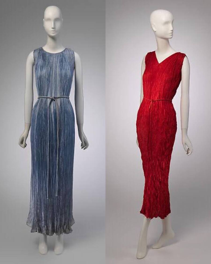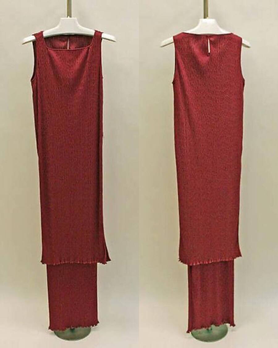 В ходе дальнейшего исследования удалось выяснить, что технология плиссировки, используемая в платье, была запатентована дизайнером в 1970-е годы и в целом по силуэту платье больше всего соответствует именно этой декаде в творчестве дизайнера.