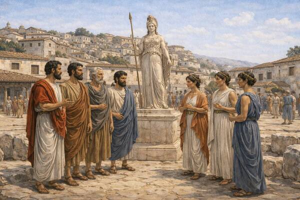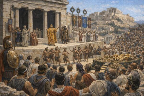 В наушниках: звуки, которые горожанин встречает, проходя мимо крыльца дома одной афинской семьи во время прогулки по тенистым переулкам города: неумелые звуки музыки — ребенок играет на инструменте, скрип кожаных ремешков — мужчина плетет сандалии, обстук деревянных приборов о металлическую посуду и шуршание платья по камню — хозяйка дома выходит во двор, чтобы позвать семью на только что приготовленный обед.