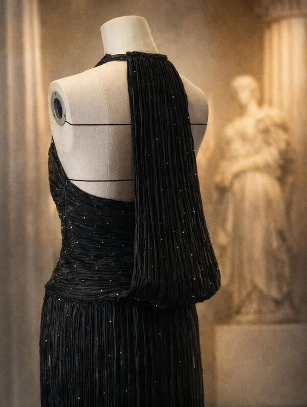 Плиссирование платья и форма «платья-колонны» будет демонстрировать, как рифмуются по визуальному ритму и смыслу разные типы медиумов, разделенные 2,5 тысячами лет.