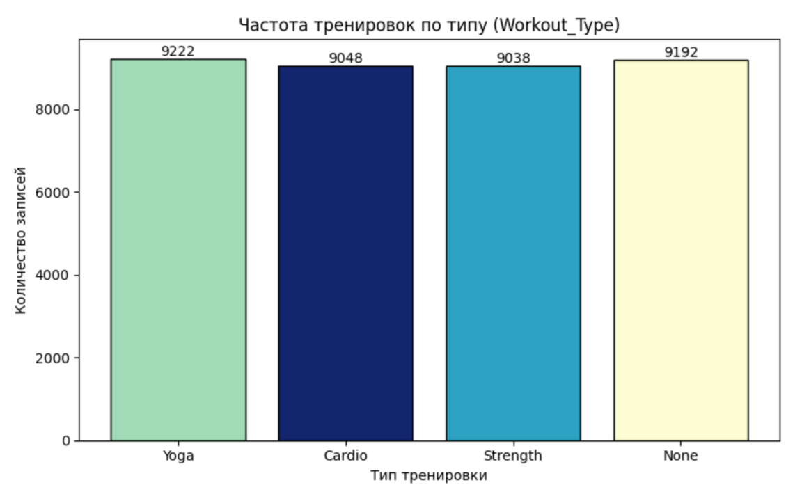 Можно сказать, что Yoga — самый частый тип тренировок, а None (без тренировки) — имеет почти столько же записей, сколько этот же тип тренировки. Вероятно, в эти дни энергия у наблюдаемых людей тратится минимально.