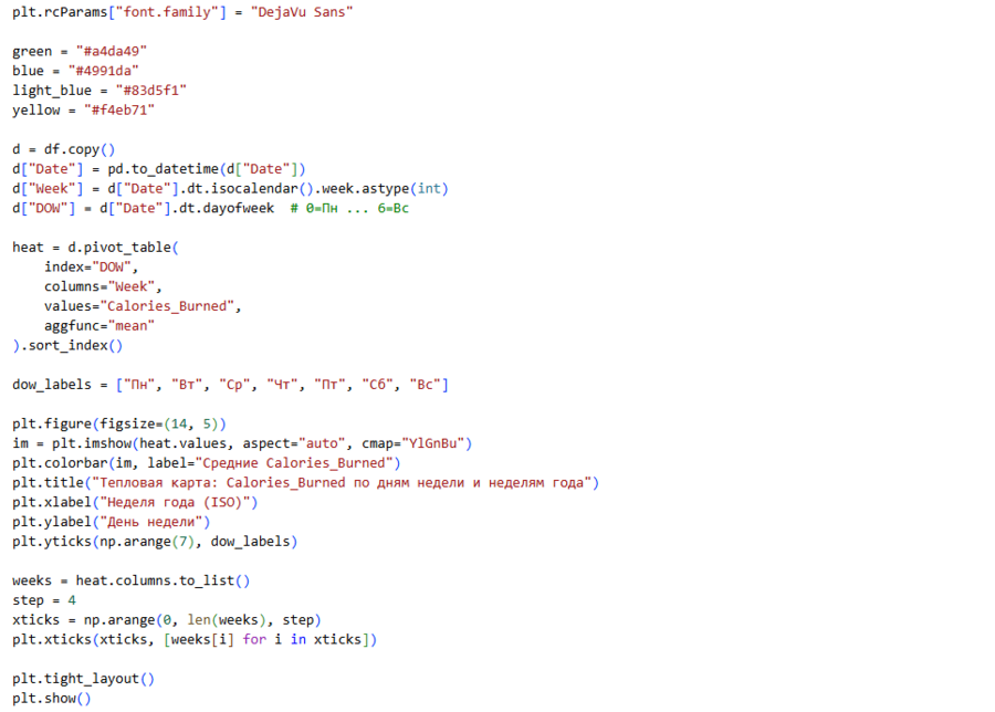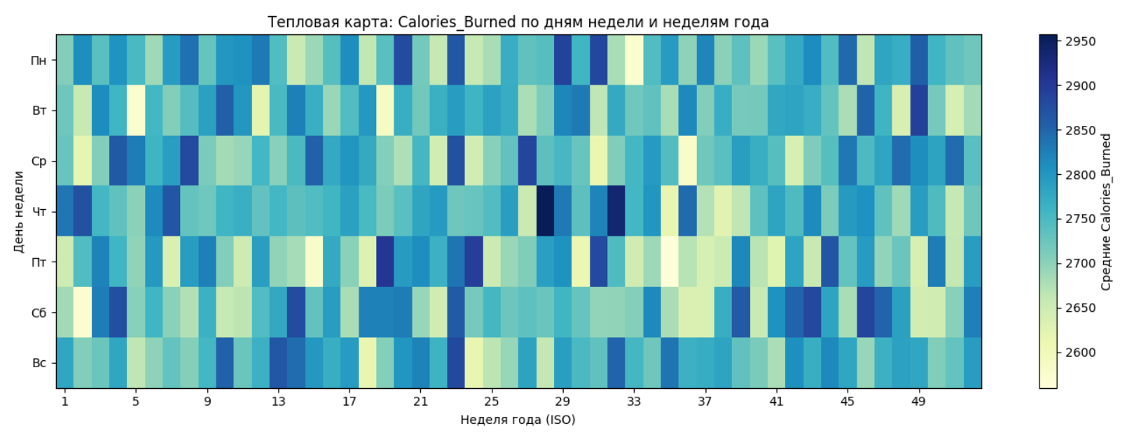 Синим цветом обозначено большее количество сожжённых калорий, а жёлтым — наименьшее. Самое интенсивное сжигание калорий происходит в субботу и воскресенье — обычно самые тёмные (насыщенные) области на тепловой карте, особенно в середине года (недели ~20–40). Это говорит о том, что в выходные физическая активность выше, возможно, из-за большего количества свободного времени на неделе.
