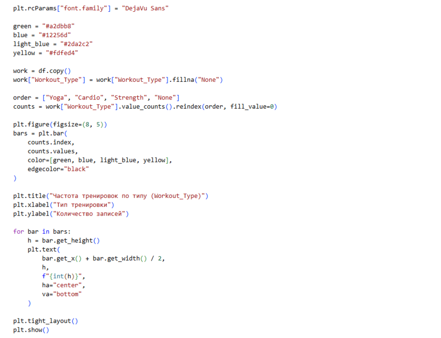 Почему именно столбчатая диаграмма? Этот график чётко показывает разницу между категориями. С помощью него легко сравнивать данные даже при большом количестве наблюдений. Анализ представлен в виде объема записей для каждого типа тренировок. Я хотела выявить, у какой группы тренировок выше активность?