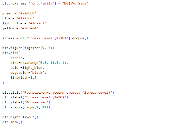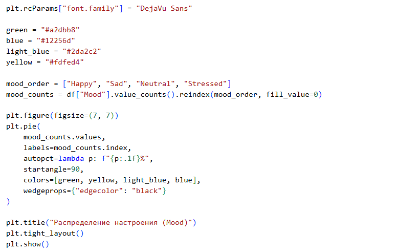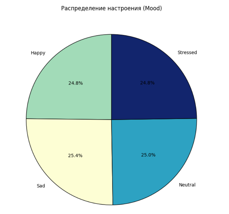 Что и требовалось доказать, довольно большое количество факторов влияет на физическое и ментальное состояние человека. Анализ данных показал, что физическая активность и эмоциональное состояние тесно связаны с режимом дня и временем года: пик активности приходится на выходные (суббота, воскресенье), особенно летом — калории сжигаются интенсивнее. Настроение во время тренировок распределено почти равномерно, с минимальным перевесом в сторону грусти (Sad, 25,4%), что может говорить о психологической нагрузке от занятий. Уровень стресса во время нагрузок может подниматься до умеренных значений (3–8 баллов). Однако большинство записей фиксируют почти полное отсутствие стресса (уровень 1), что указывает на расслабляющий эффект регулярной активности.