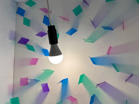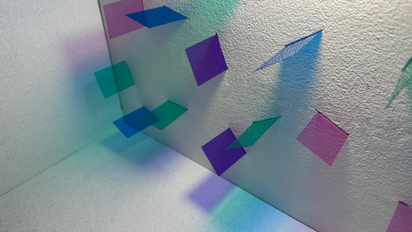 Идея арт-объекта появилась при создании артбука для проекта. Я объединила графическую часть картин Виктора Вазарели и его стремление к созданию эффекта «ожившего пространства». Внутри конструкции арт-объекта расположены полупрозрачные цветные панели из цветного пластика и источник света. Перемещение источника света создает многослойные световые узоры, создавая эффект движения и глубины. Арт-объект является интерактивным и функциональным — зритель может войти вовнутрь и стать частью визуальной композиции, наблюдая взаимодействия света и цвета.