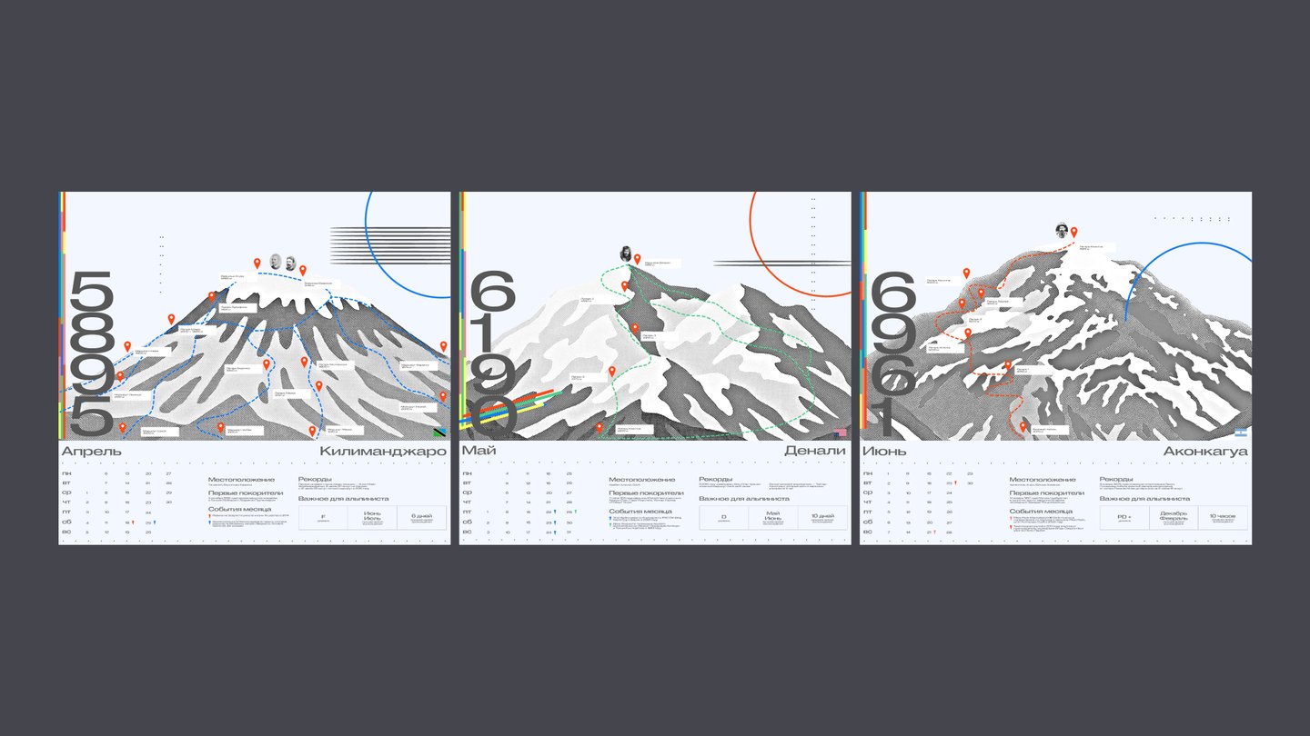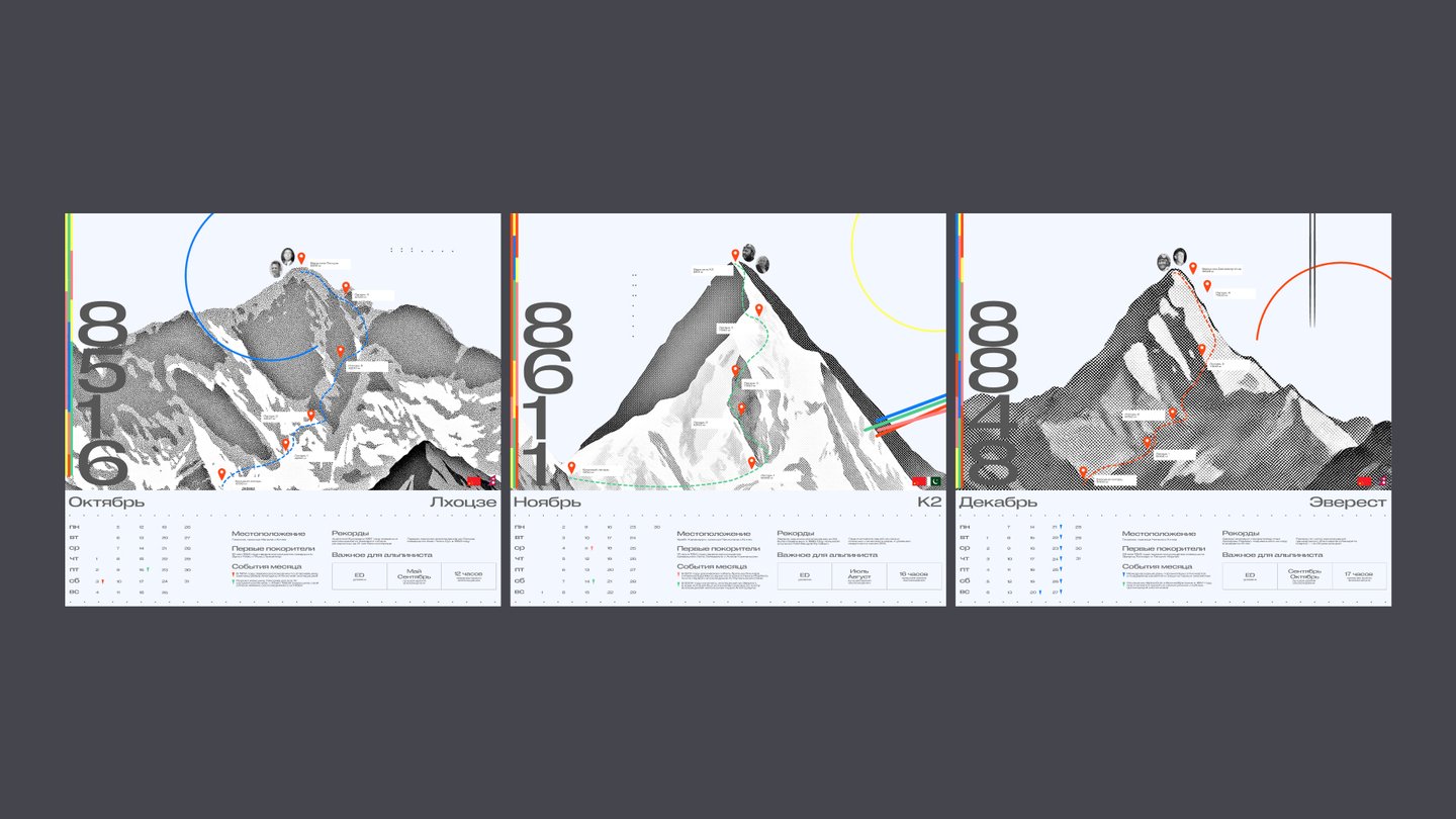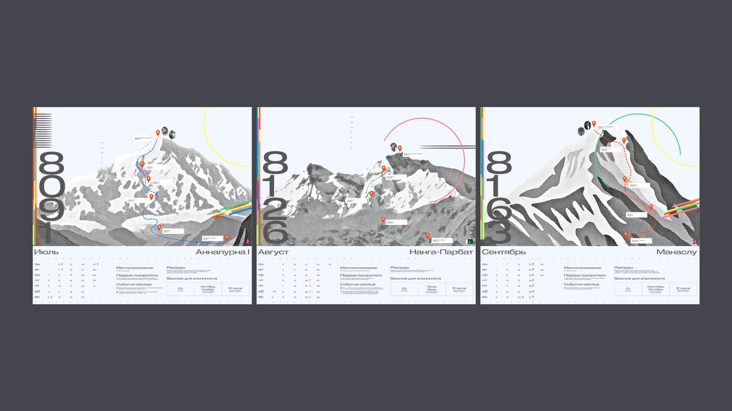 Календарь демонстрирует особенности двенадцати величайших пиков мира и увековечивает историю альпинизма