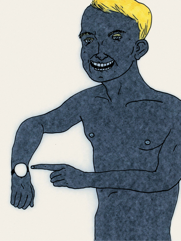 A handsome naked boy was sitting in the waiting room thoroughly hiding his face