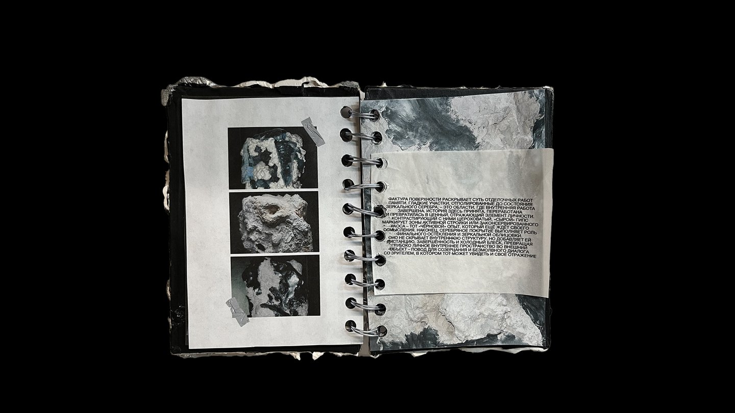 Отпечатанные силуэты представляют каркас личности, а сквозные отверстия служат каналами для света озарений и пустоты забвения. Фактура поверхности отражает «ремонт» памяти: гладкие участки — это принятые истории, а шероховатый гипс — зоны необработанного опыта.