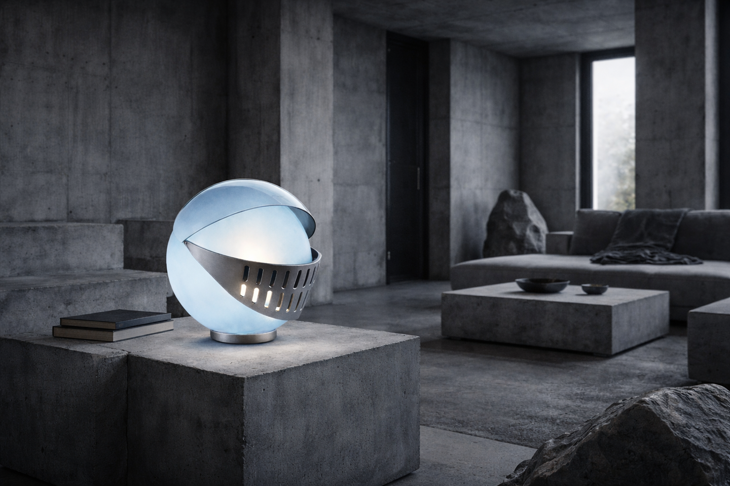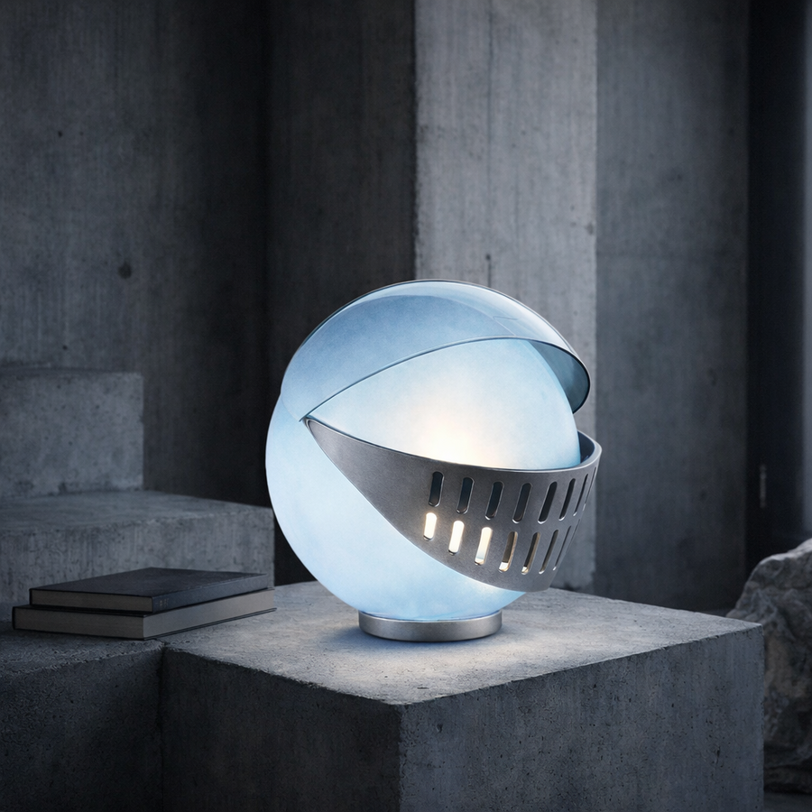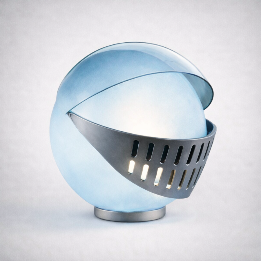 Лампа вдохновлённая рыцарским забралом и тем как оно модернизировалось сейчас вещь без которой не обходятся мотоциклисты и гонщики. Она отсылает к образу средневекового шлема рыцаря, но переосмысленного через язык современного индустриального и минималистичного дизайна.