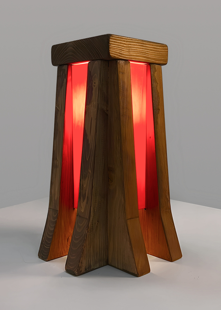 Конструкция объекта позволяет использовать лампу как напольный или настольный источник света, легко включая его в разное пространство. Красное свечение мягко заполняет окружение, создавая спокойную вечернюю атмосферу для отдыха и уединения.