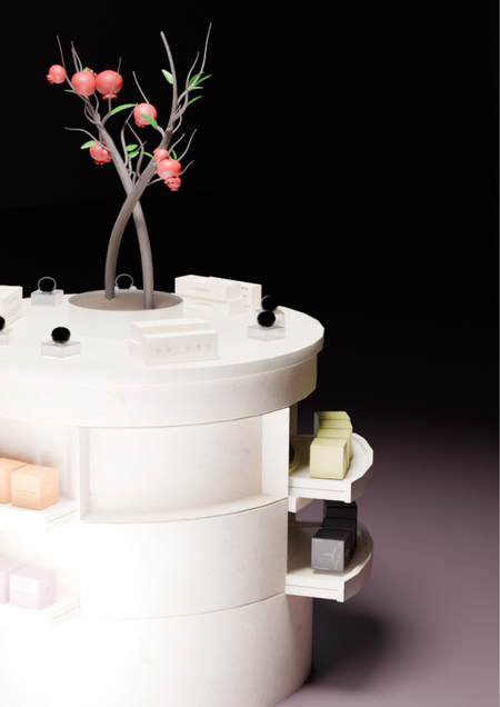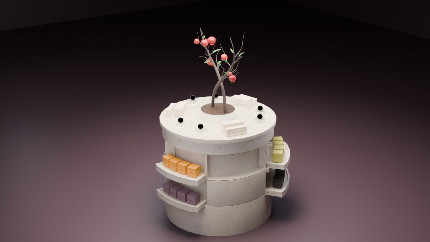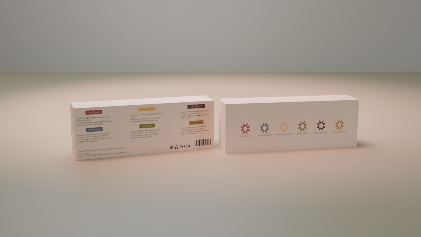 Стенд продаж для парфюмерной лавки LACRIMAE — бренда ароматов Израиля, который создаёт парфюм, где каждый аромат связан с одной из шести легенд этой страны. Бренд, рассказывающий о красоте и богатстве израильской культуры через ингредиенты-символы.